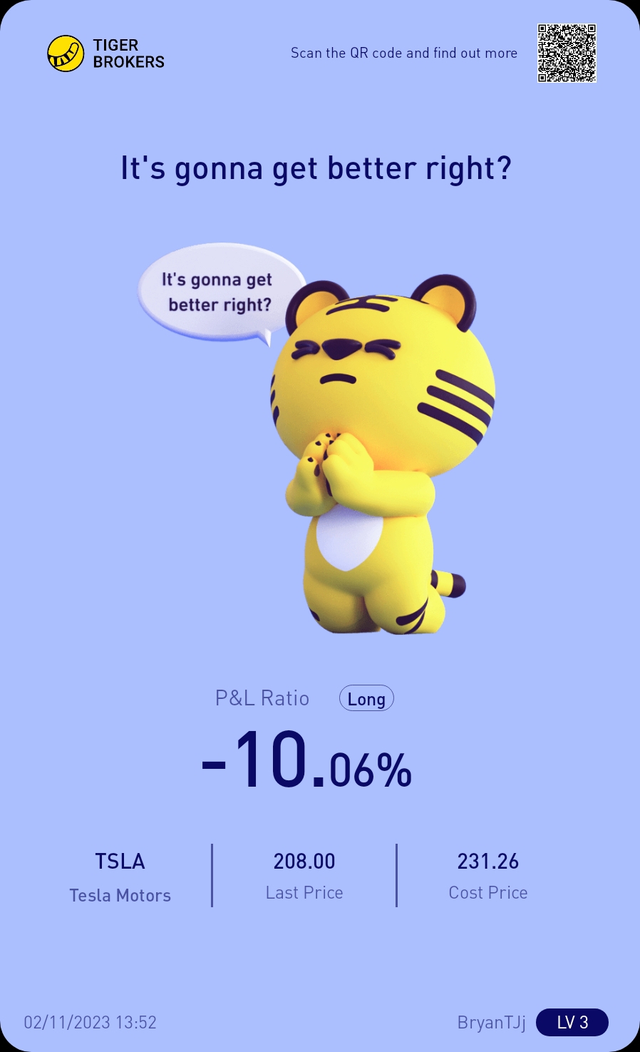 $Tesla Motors(TSLA)$ So shcocking on such a huge drop, though I am at th bottom but the bottom keep bottom, at one point it was -20%. Lucky it is TSLA or will already stop-loss. Still believe the fundamental so no worries :)