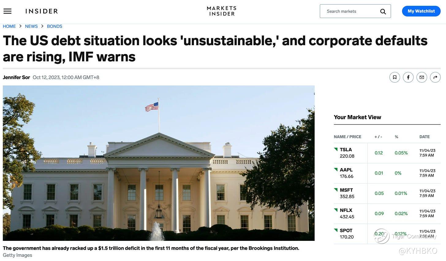 The US's $33 trillion debt pile is reflecting "unsustainable" fiscal policy, the IMF said.The government has already racked up a $1.5 trillion deficit in the first 11 months of 2023."Under unchanged policies, debt dynamics in the US are very unfavorable," the IMF warned.