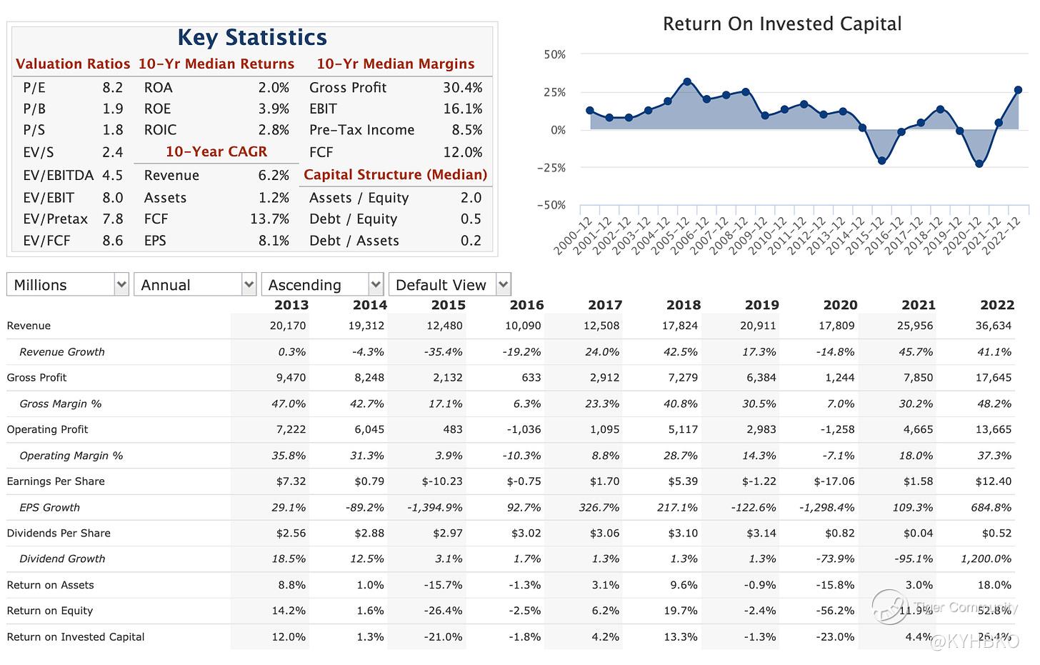 • Revenue grew from $20.17B (2013) to $36.63B (2022), a 80% growth over 10 years.