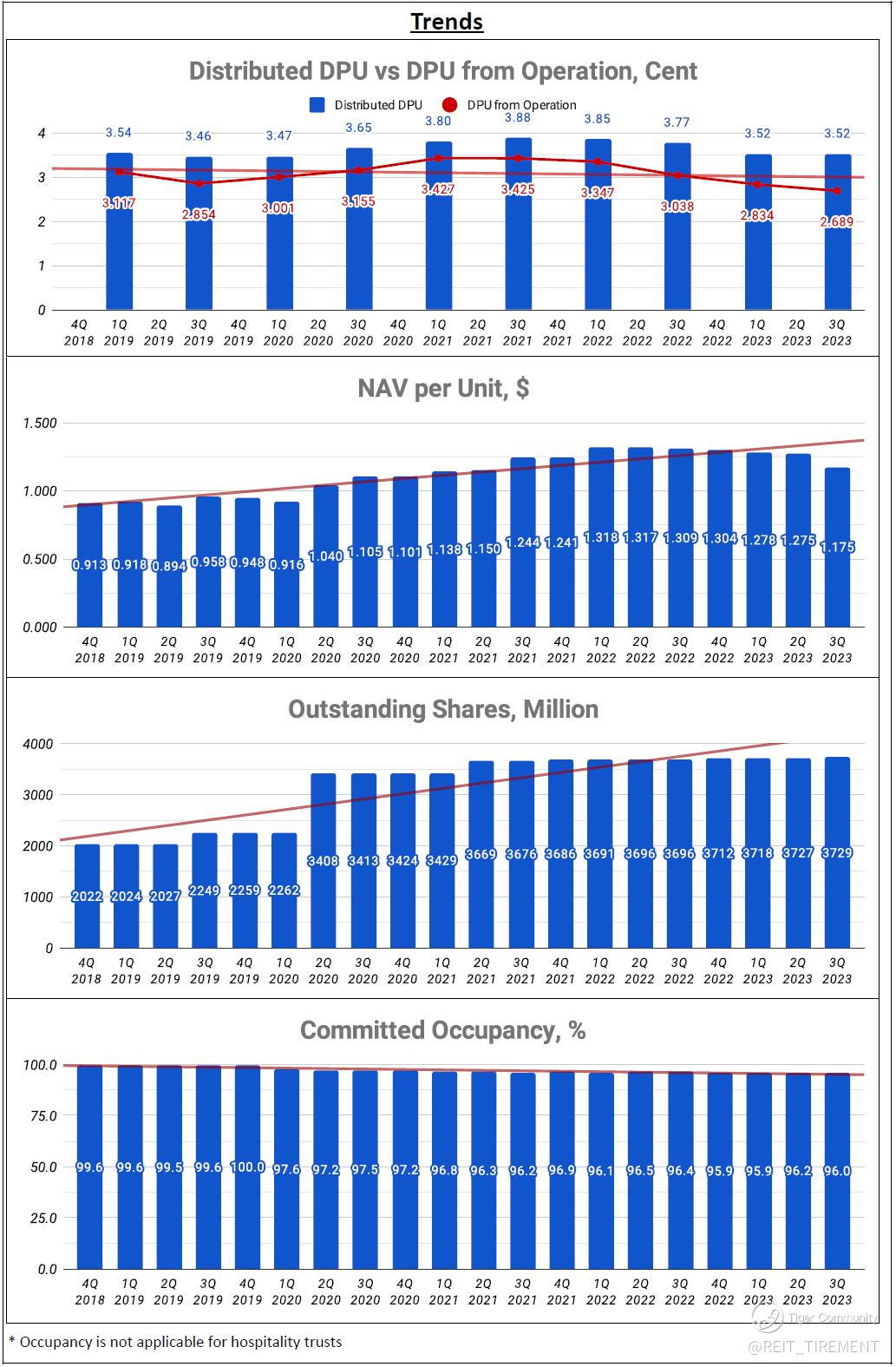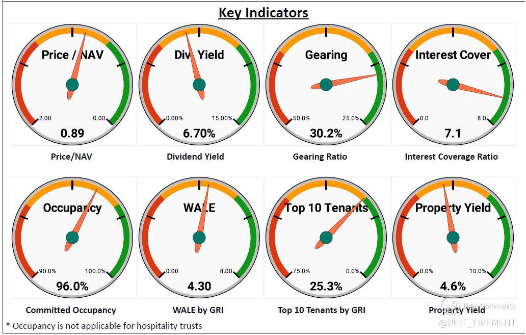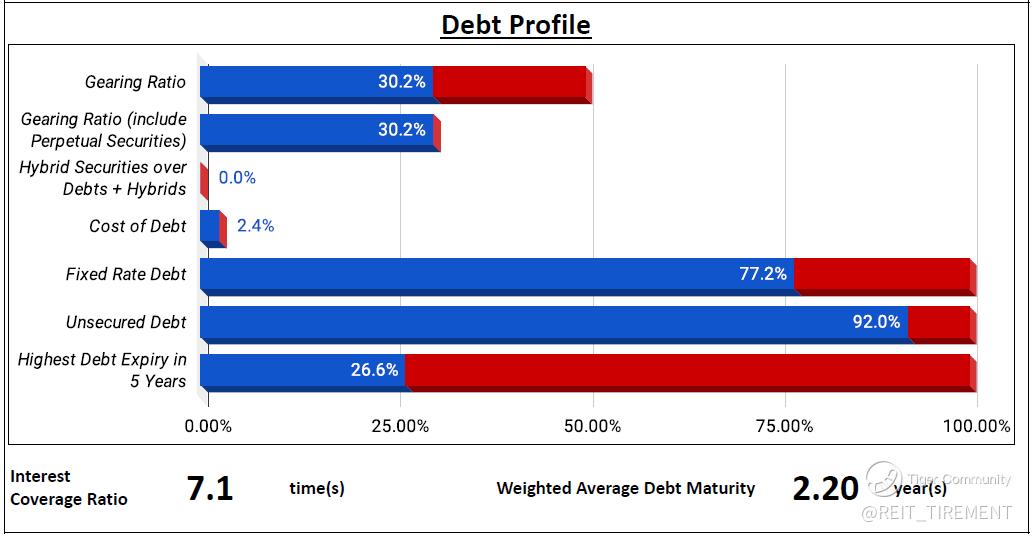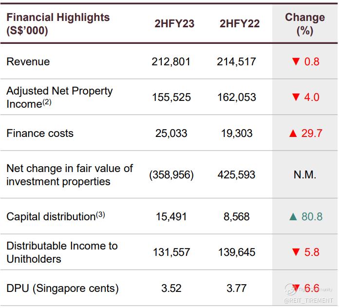 Compared to the previous half-year, NPI remains similar though there is a slight improvement in gross revenue. Nonetheless, DPU remains the same at 3.52 cents, despite an increase in finance costs and trust expenses, as well as a reduction in rental support. This is primarily attributable to higher distributions from divestment gains. For debt, about 25% of debt will be matured in the coming 12 months, with over 98% of it maturing in 2H FY24.