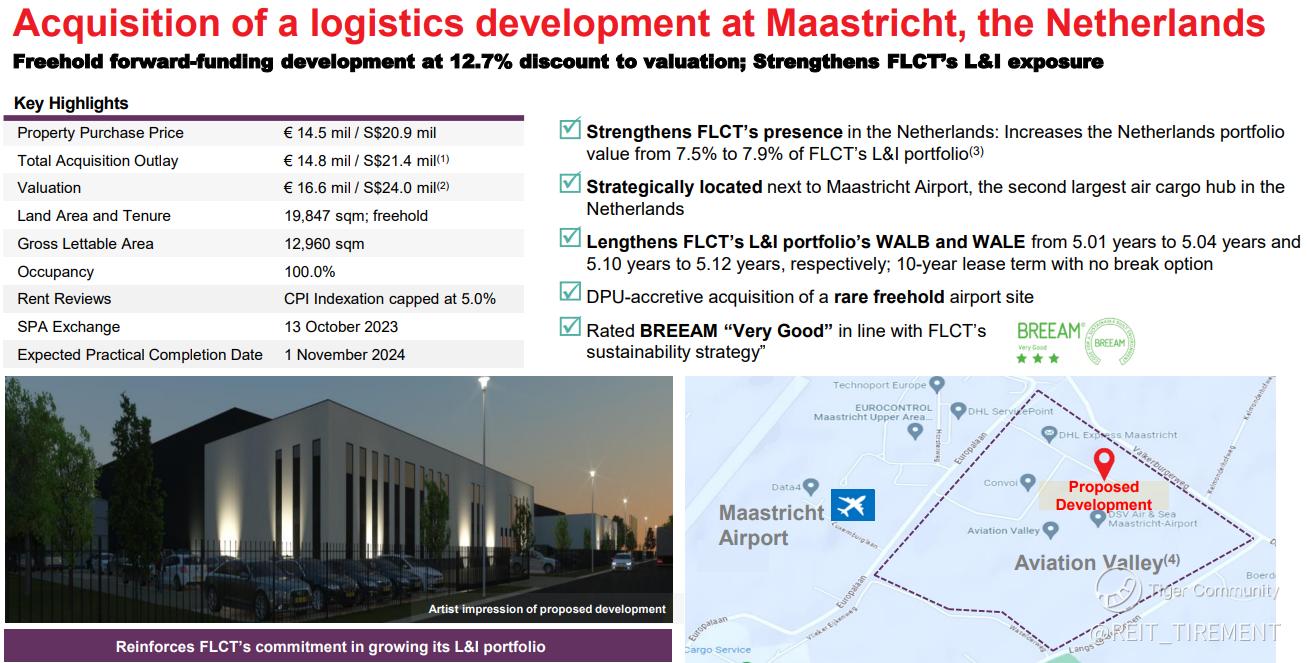 FLCT acquired a freehold forward funding logistics development at Maastricht, Netherlands. The expected practical completion date for the development is 1 November 2024.