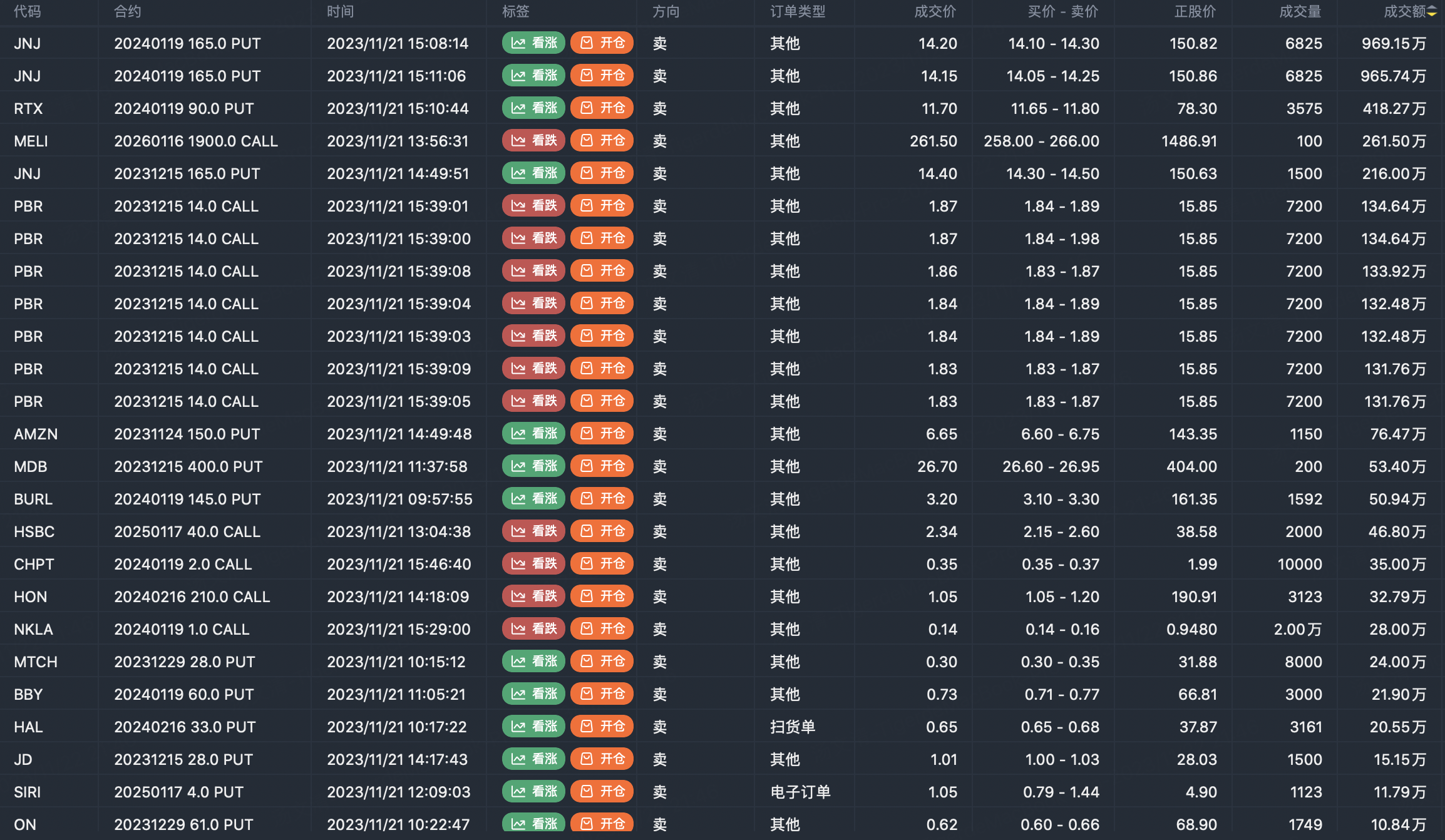 Note: This image data is from Tiger PC. This screen is a significant sell open position for an option contract in the market. A sell of a call option means that the trader believes that the underlying trend has peaked, and a sell of a put option means that the trader believes that the underlying trend has bottomed. These contract openings typically indicate significant activity in the underlying stock, including whether the trader is willing to accumulate a long or short option position.
