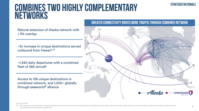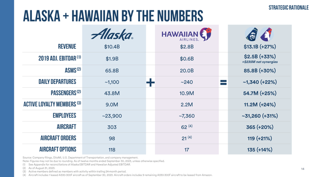 The combined enterprise will serve 87 unique destinations that are outbound from Hawaii, granting travelers a higher number of unique destinations that are outbound than any other player in that market. And for the West Coast, the combined firm will have 433 unique routes departing, making it a massive player there. Over the trailing 12-month window ending at the end of August, the combined company will have 1,340 average daily departures that collectively carry 54.7 million passengers each year. 10.9 million of those passengers alone utilize Hawaiian Airlines. The transaction brings with it 62 aircraft, the vast majority of which are owned, with a remaining leased, to create a behemoth with 365 aircraft.