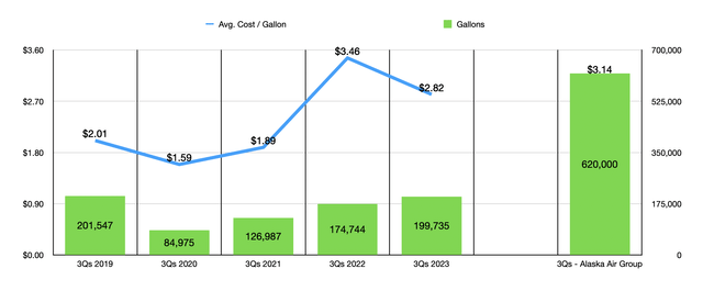 Even if we accept that, we also need to contend with the fact that cost structures in the airline industry have changed dramatically over the past few years. In the chart above, for instance, you can see, for the first nine months of each year, the percentage of revenue from Hawaiian Holdings that went to aircraft fuel, as well as, in the chart below, both the average cost of fuel per gallon and the total number of gallons that the airline used. As the industry showed signs of recovery, it only makes sense that the total number of gallons would improve. But because of rising oil prices, jet fuel costs have gone through the roof. In the first nine months of this year, they came in at $2.82 per gallon. That's up from the $2.01 per gallon seen back in 2019. There's nothing, besides perhaps marginal improvements that could be had from flexing its combined buying power, that these firms can do to bring those costs down. The chart shown below shows that even Alaska Air Group has had to allocate a significant amount of its revenue so far this year to aircraft fuel.