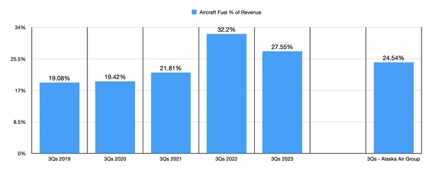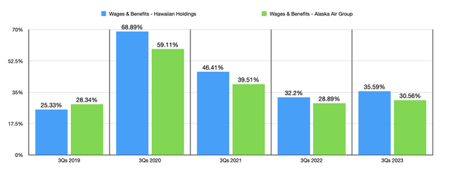 Investors who are fond of this transaction might say that this is fine because it puts everybody on more or less equal footing. I can accept that. But then you also have the fact that wages and benefits have gone up tremendously as well. Back in 2019, Hawaiian Holdings had to allocate 25.3% of its revenue toward covering wages and benefits. By the third quarter of this year, that number has shot up to 35.6%. Management has attributed some of this increase to the cargo transportation partnership that Hawaiian Holdings has been working on with Amazon (AMZN). But it is clear that elevated wages are an issue as well when it comes to Alaska Air Group.