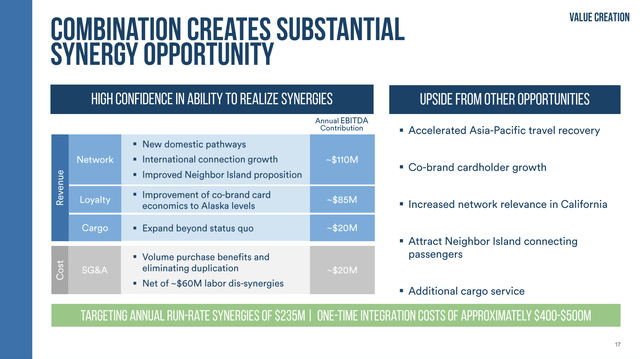 At first glance, the transaction between these two companies makes a great deal of sense. For starters, Alaska Air Group is forecasting $235 million in annual run rate synergies. $110 million of this will come from additional revenue opportunities involving domestic pathways, international connection growth opportunities, and other initiatives. $85 million will be on the loyalty side since the companies can co-brand their cards and receive more favorable economics on that front. Another $20 million can involve cargo opportunities. And on the cost side, there exists about $20 million worth of opportunities associated with volume purchase benefits and reducing duplicative functions. Of course, this won't come cheap. Management is forecasting one-time integration costs of between $400 million and $500 million associated with these initiatives.