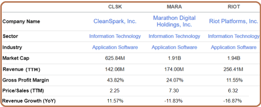 Compared with $Marathon Digital Holdings Inc(MARA)$ and $Riot Blockchain, Inc.(RIOT)$, $CleanSpark, Inc.(CLSK)$’s profit margin is indeed the highest at 43.8%. Its profitability surpasses its peers by over 19%, especially when compared to Marathon.