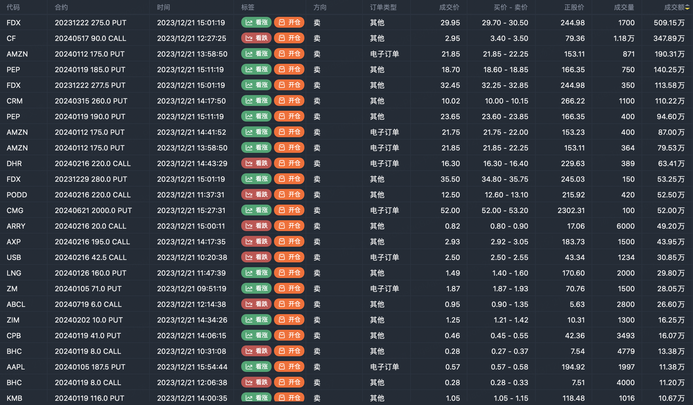 Note: This image data is from Tiger PC. This screen is a significant sell open position for an option contract in the market. A sell of a call option means that the trader believes that the underlying trend has peaked, and a sell of a put option means that the trader believes that the underlying trend has bottomed. These contract openings typically indicate significant activity in the underlying stock, including whether the trader is willing to accumulate a long or short option position.