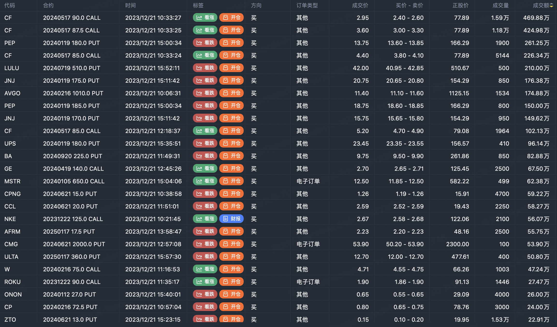 Note: This image data is from Tiger PC. This screening is a significant buy open position for options contracts in the market. The purchase of a call option means that the trader believes that the underlying has upward momentum, and the purchase of a put option means that the trader believes that the underlying has downward momentum. These contract openings typically indicate significant activity in the underlying stock, including whether the trader is willing to accumulate a long or short option position.