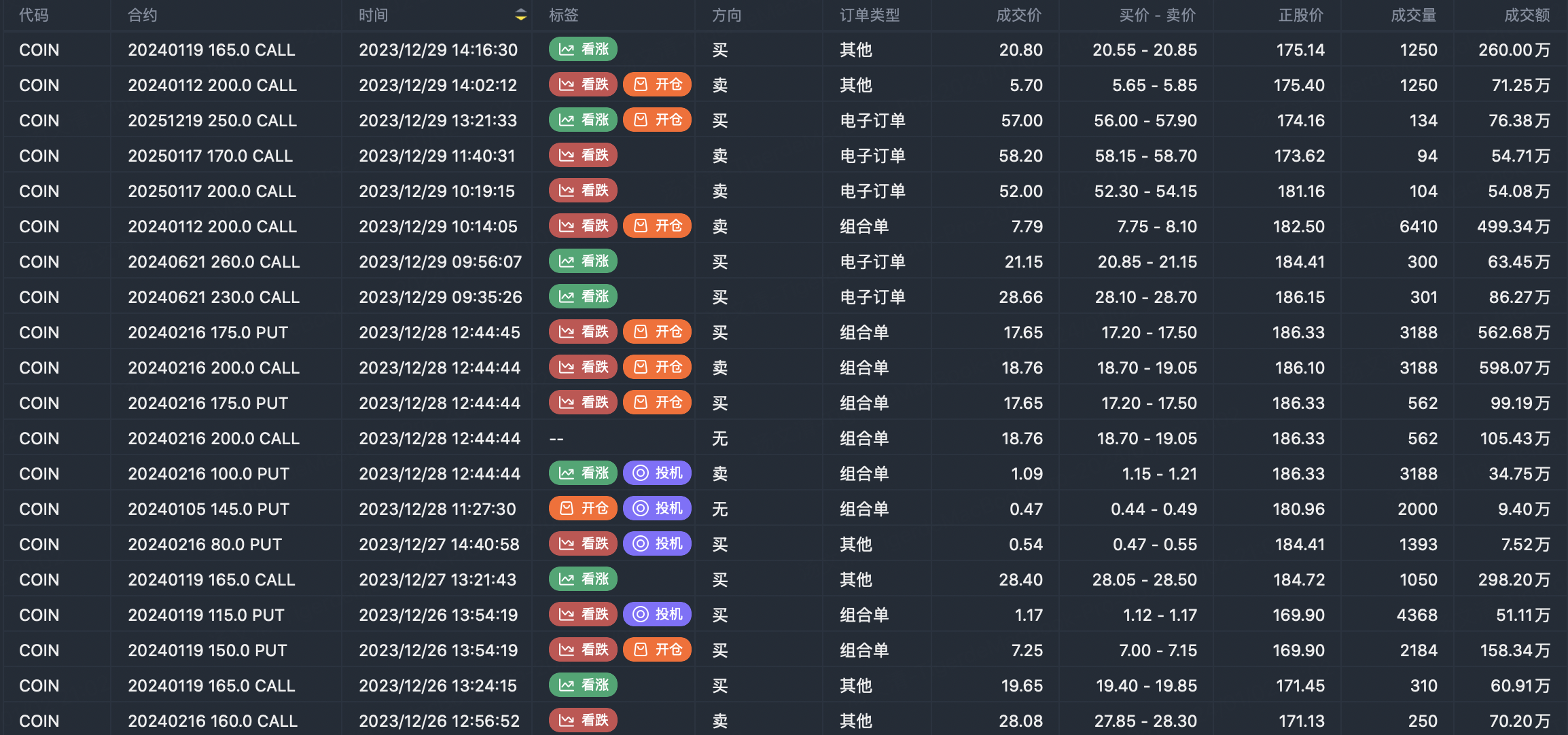 $Coinbase Global, Inc.(COIN)$ Option moves shows selling call options recently traded: $COIN 20240112 200.0 CALL$