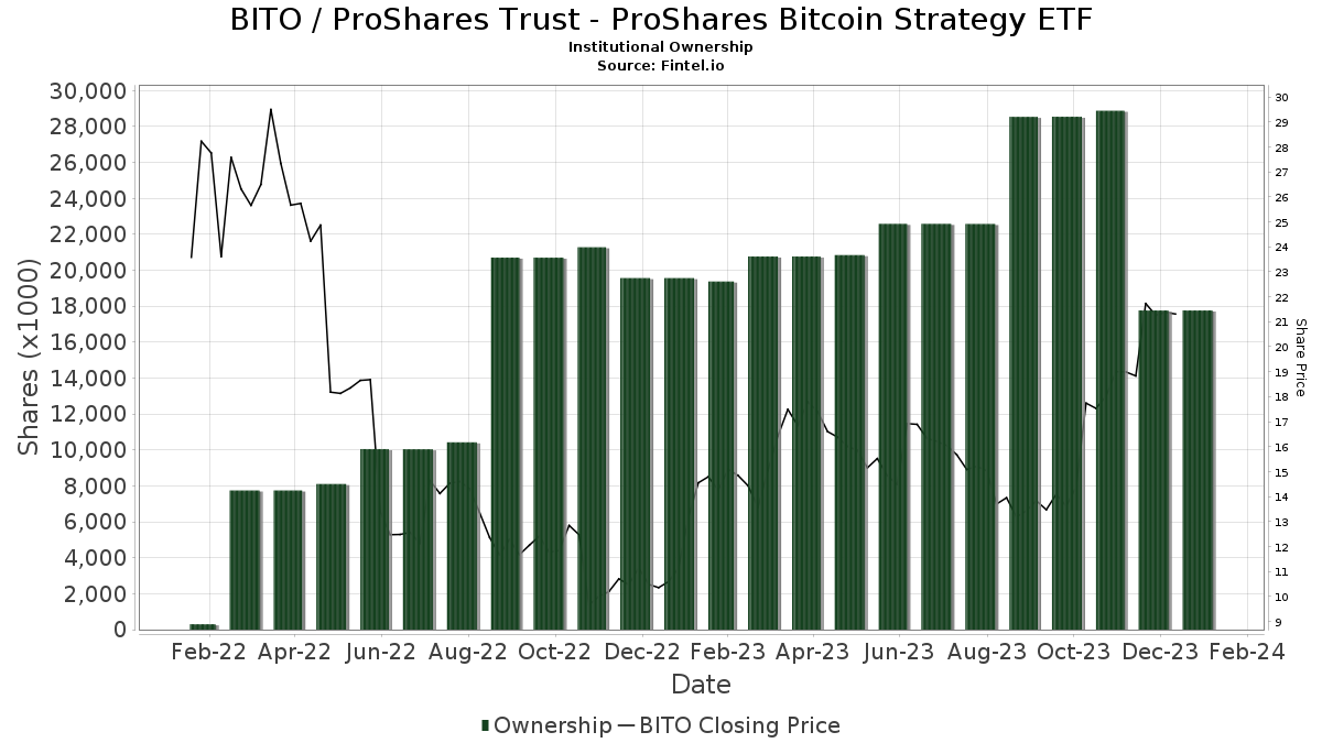 $ProShares Bitcoin Strategy ETF(BITO)$ has 166 institutional owners and shareholders that have filed 13D/G or 13F forms with the Securities Exchange Commission (SEC). These institutions hold a total of 18,692,188 shares. Largest shareholders include Goldman Sachs Group Inc, Jane Street Group, Llc, Susquehanna International Group, Llp, Acorns Advisers, LLC, Susquehanna International Group, Llp, Susquehanna International Group, Llp, Parallax Volatility Advisers, L.P., Ambassador Advisors, LLC, Citadel Advisors Llc, and Citadel Advisors Llc .