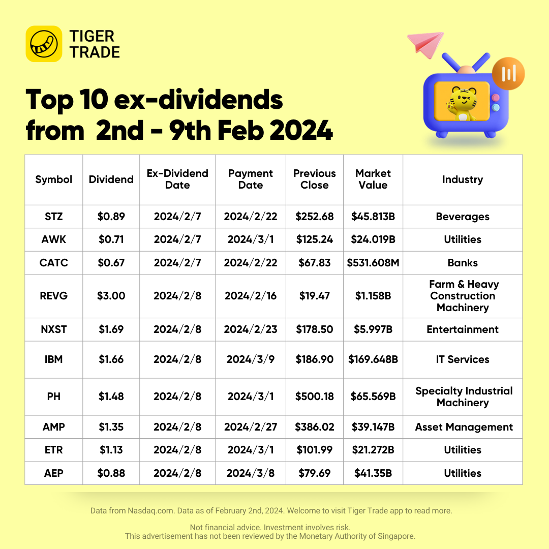 Be Sure To Check Out the Last Chance to Buy the top 10 Stocks Going to Ex-dividends This Week: $Constellation(STZ)$ , $American Water(AWK)$, $Cambridge Bancorp(CATC)$ , $Rev Group Inc.(REVG)$, $Nexstar Broadcasting(NXST)$ , $IBM(IBM)$, $Parker Hannifin(PH)$ , $Ameriprise(AMP)$, $Entergy(ETR)$, $American Electric Power(AEP)$
