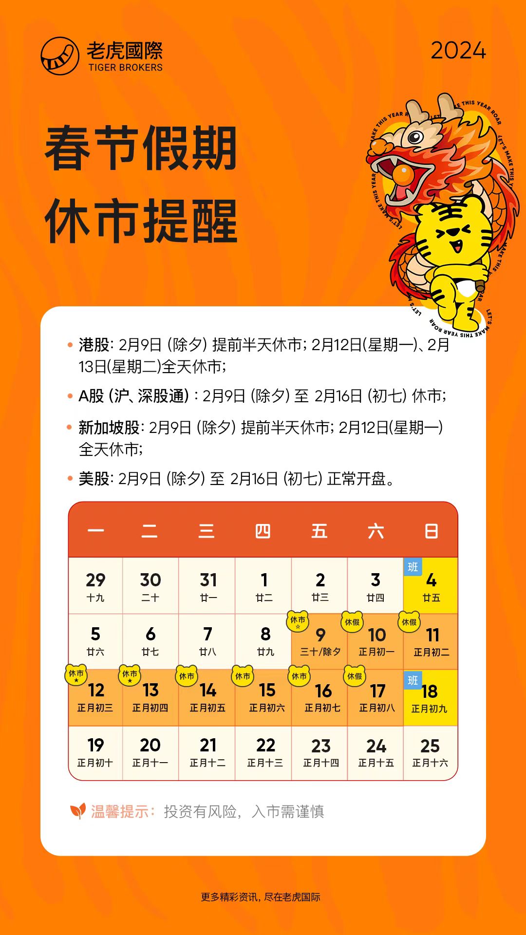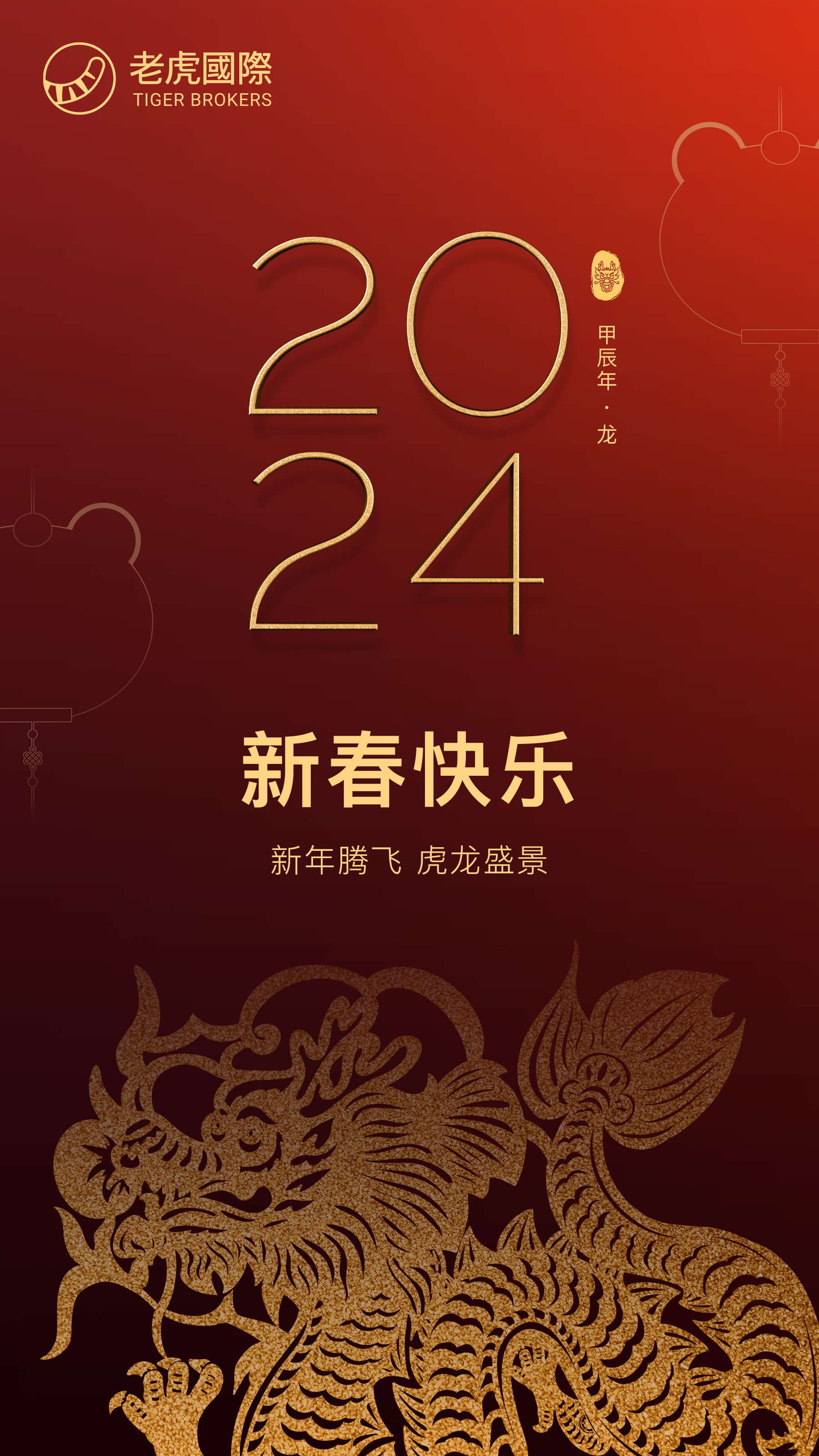 新春將至,感謝各位虎友的陪伴,在一年一度的新春佳節,萬家團圓的時刻,老虎證券祝您和您的家人身體健康,萬事如意,財源廣進,龍騰虎躍,“龍”光煥發,“龍”華富貴,萬事興“龍”🐲🐲。