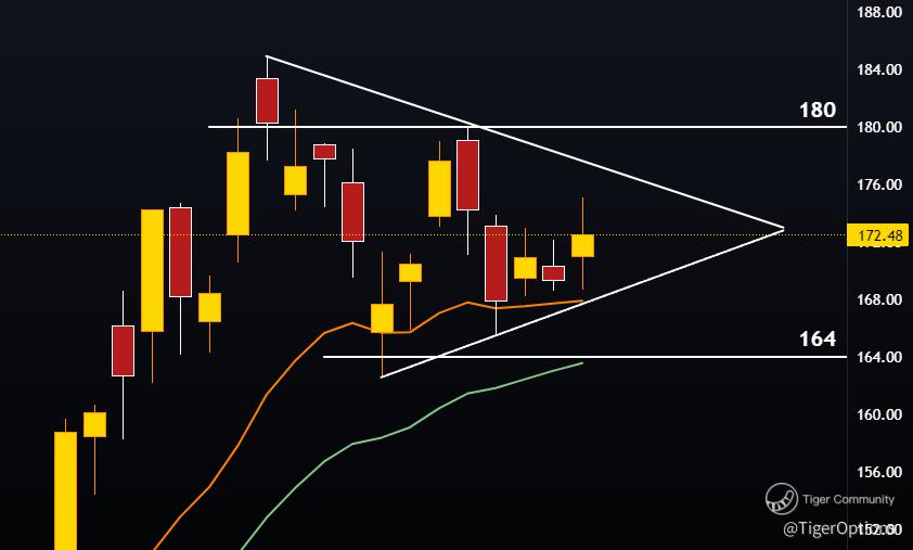 From a technical perspective, AMD exhibits a consolidation pattern, forming a symmetrical triangle. The price has held above the 10EMA, suggesting potential support. If the price moves lower, a target around 163-164, aligned with the 20EMA, could provide a buying opportunity. Conversely, a breakout could signal a bullish trend, setting the stage for a potential new all-time high.