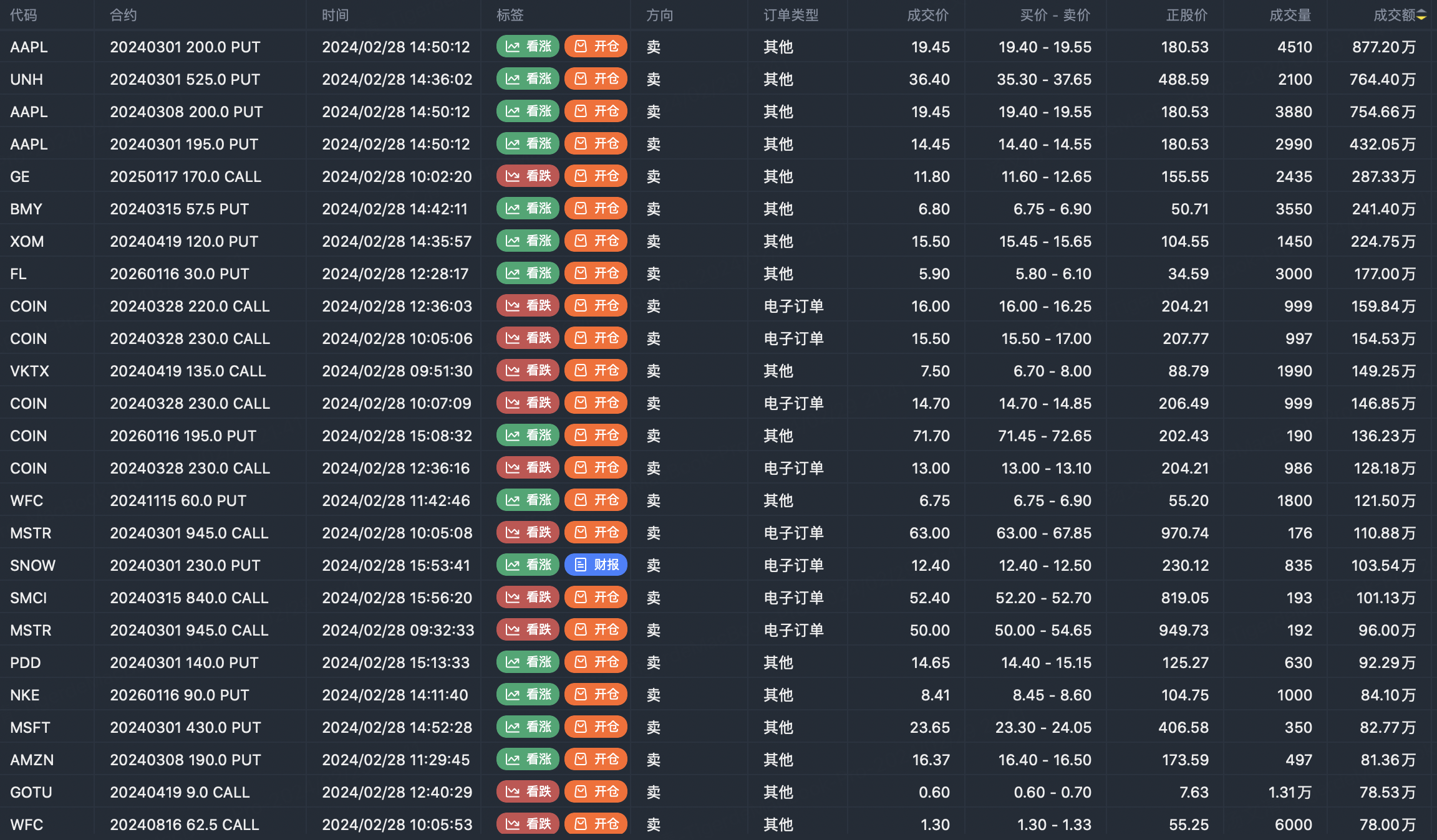 Note: This image data is from Tiger PC. This screen is a significant sell open position for an option contract in the market. A sell of a call option means that the trader believes that the underlying trend has peaked, and a sell of a put option means that the trader believes that the underlying trend has bottomed. These contract openings typically indicate significant activity in the underlying stock, including whether the trader is willing to accumulate a long or short option position.