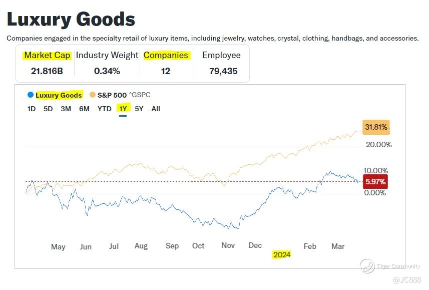 Collectively, luxury goods yielded a +5.97% gain from 27 Mar 2023 to 22 Mar 2024.