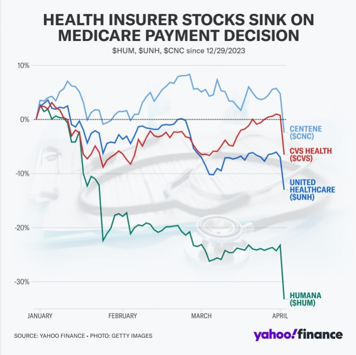 The "surprise" decision impacted major names like Humana ( $Humana(HUM)$ , down 13%) and United Healthcare ( $UnitedHealth(UNH)$ ther companies with exposure to Medicare insurance such as CVS Health ( $CVS Health(CVS)$ , down 8%).