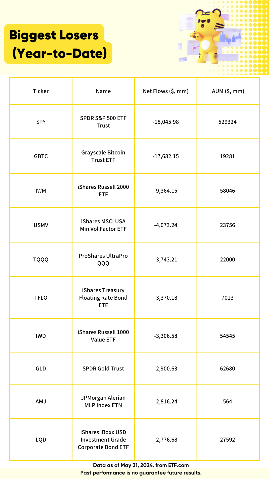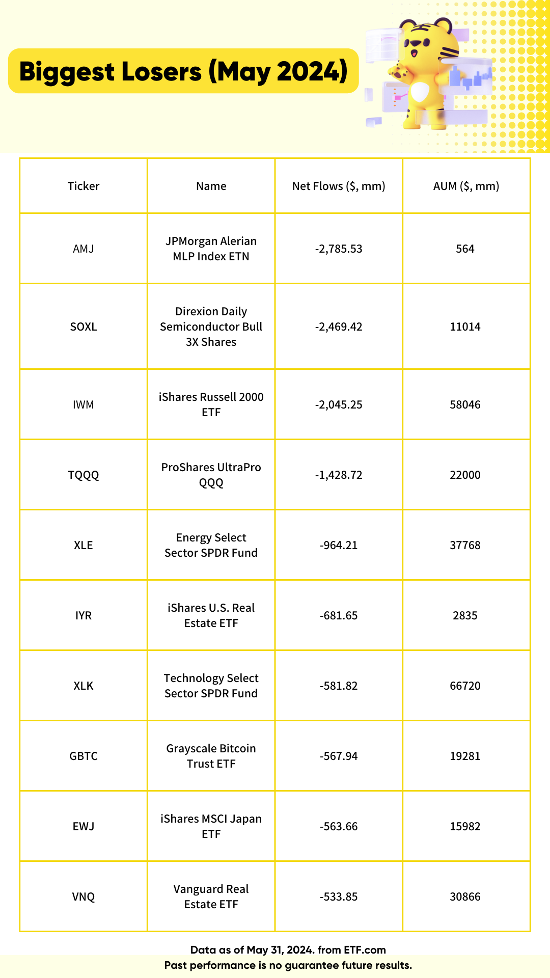 On the other hand, the $JPMorgan Alerian MLP Index ETN(AMJ)$ (AMJ), Direxion Daily Semiconductor Bull 3X Shares (SOXL), and $iShares Russell 2000 ETF(IWM)$ (IWM) topped the list of outflows, each with over $2 billion in redemptions.