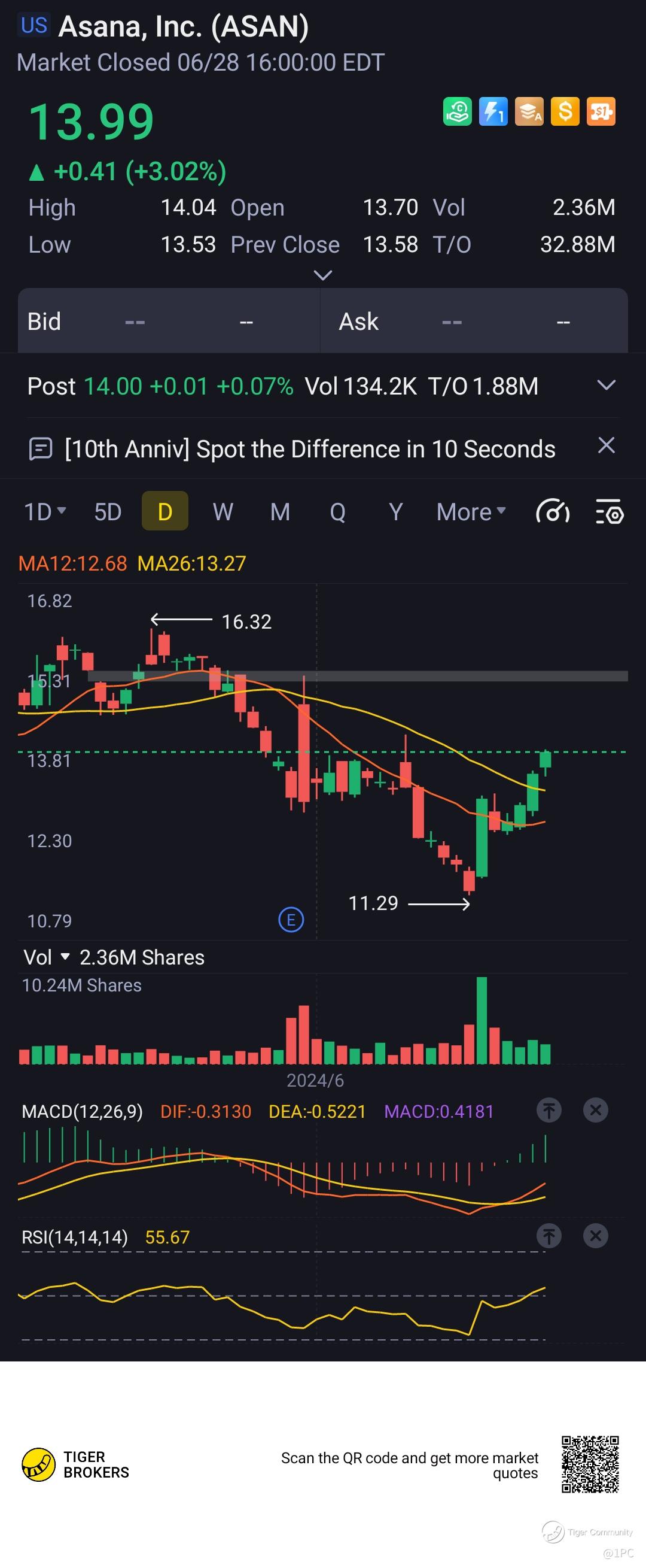 $Asana, Inc.(ASAN)$ $Asana, Inc.(ASAN)$ This is 1 counter making me π. Current Rebound πͺ seem juicy for Short Term exit and cut [Smug] [Smug] . Price actions Strong πͺ Breakout of Downtrend MA lines. Technical indicators are positive with MACD and RSI to try ... π€ What do u think[Helpless] .... To Sell and Cut or Hugged it further and Hope can return to my [Smart] cost [LOL] ... I think I will need more πΊπ» & π· to think π€ about it.