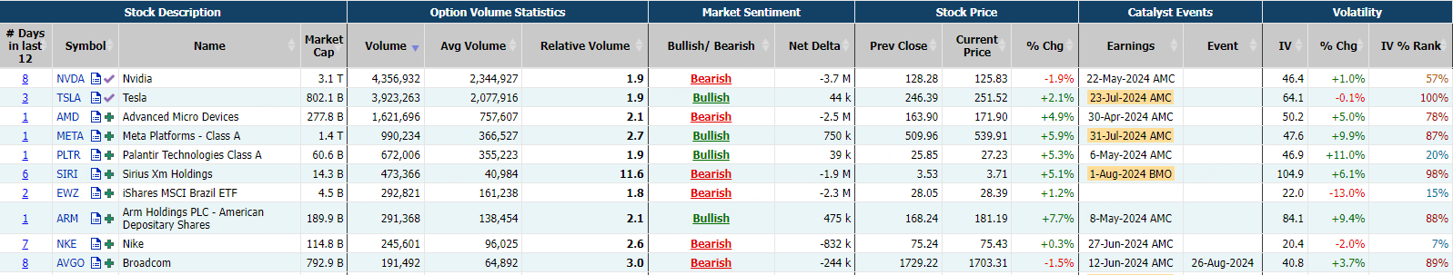 This report shows stocks with the highest volume of bullish and bearish activity by option delta volume, which converts option volume to an equivalent stock volume (bought or sold).