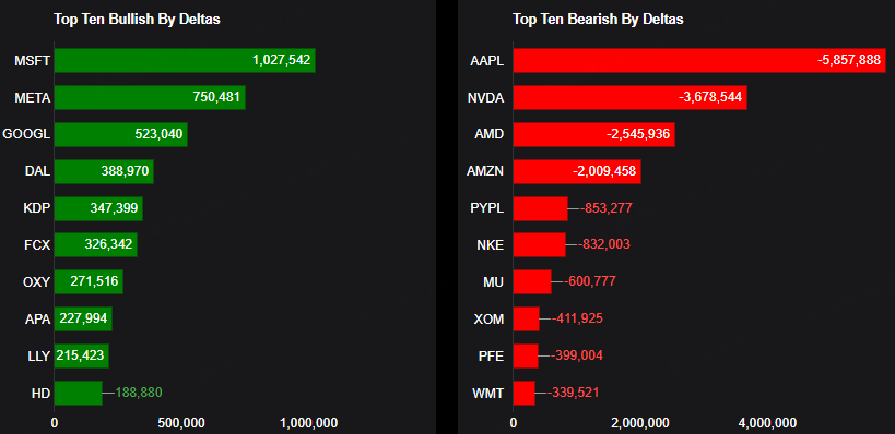 Based on option delta volume, traders sold a net equivalent of -5,857,888 shares of Apple stock. The largest bearish delta came from selling calls. The largest delta volume came from the 05-Jul-24 225 Call, with traders getting short 9,708,121 deltas on the single option contract.