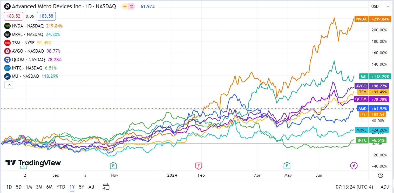 $Micron Technology(MU)$ 1 year return vs. Other Semiconductor Stocks: $NVIDIA Corp(NVDA)$ , $Advanced Micro Devices(AMD)$ $Broadcom(AVGO)$ $Taiwan Semiconductor Manufacturing(TSM)$ $Qualcomm(QCOM)$ $Marvell Technology(MRVL)$ $Intel(INTC)$