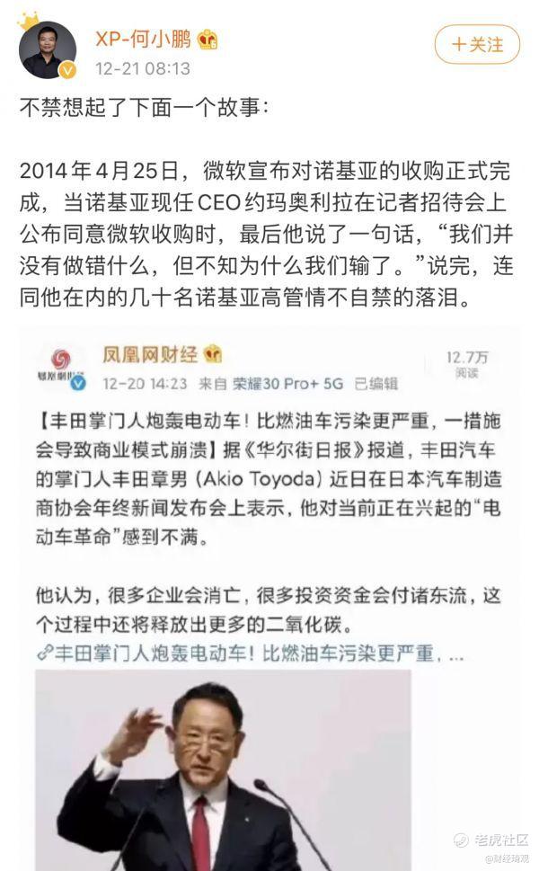 12月21日,造車新勢力小鵬汽車的創始人何小鵬出言嘲諷豐田社長,以諾基亞謝幕時的落淚揶揄對方,隱晦表達了電動車將取代傳統燃油車,勢不可擋。