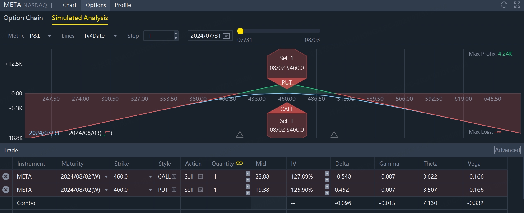 With Meta's current share price at $458.50, taking an option with a Meta strike price of $460 and an expiration date of August 2 as an example, it takes only two steps to establish a Meta short straddler strategy.