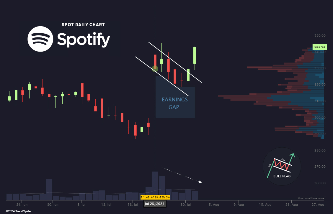 $Spotify Technology S.A.(SPOT)$ Gap up on earnings into 52-week highs, low volume pullback, continuation higher...