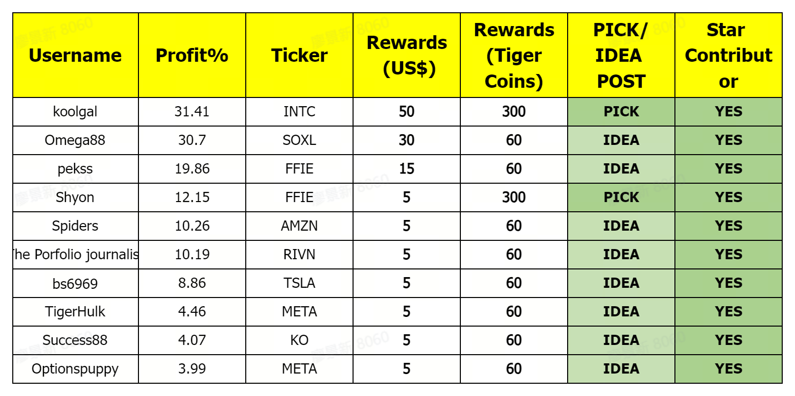Congratulations to the following Tiger Friends for winning free voucher rewards @koolgal @Omega88 @pekss @Shyon @Spiders @The Porfolio journalist @bs6969 @TigerHulk @Success88 @Optionspuppy! And let's specially congratulate the Tigers who are “Star Contributors” For winning additional coins.