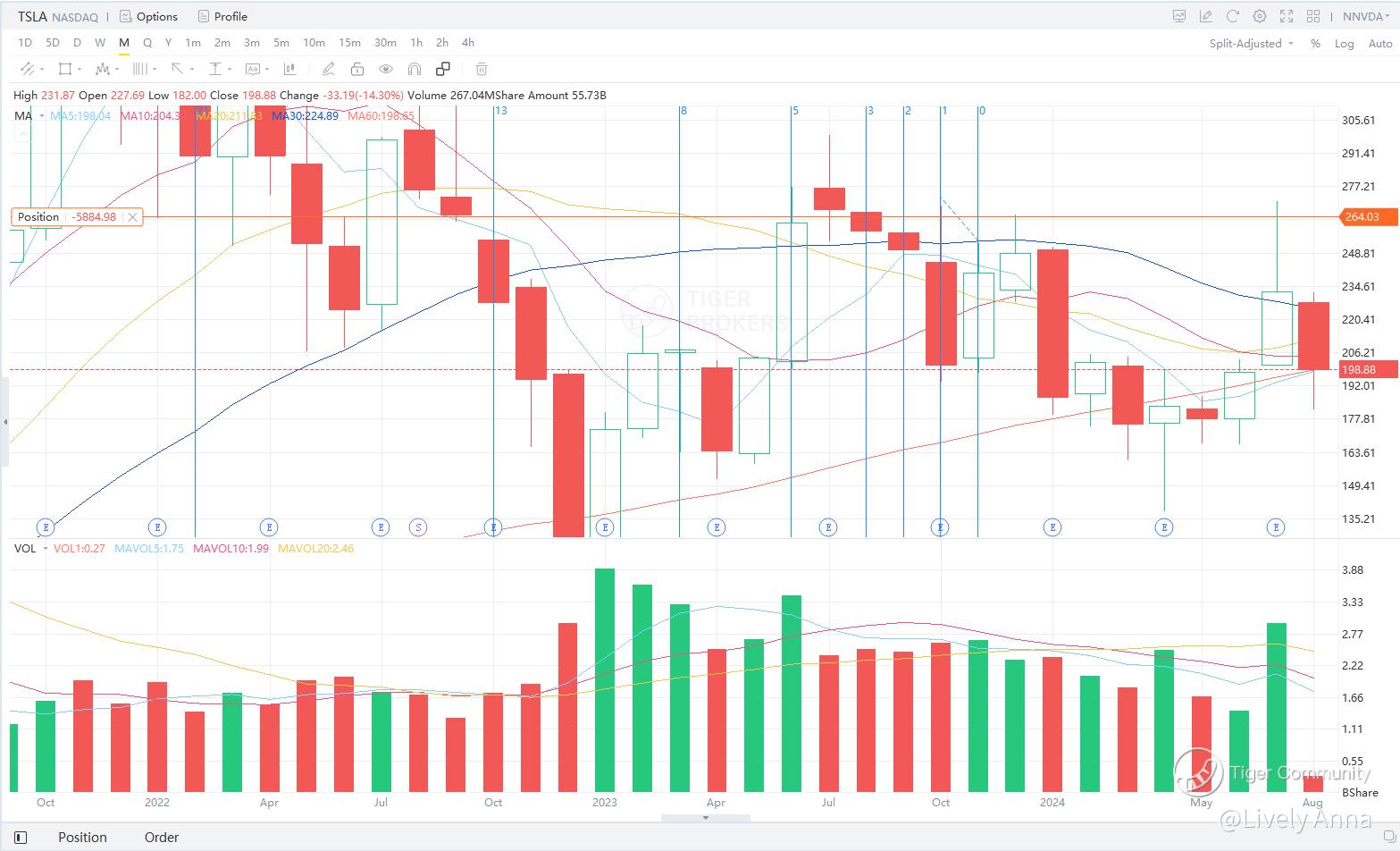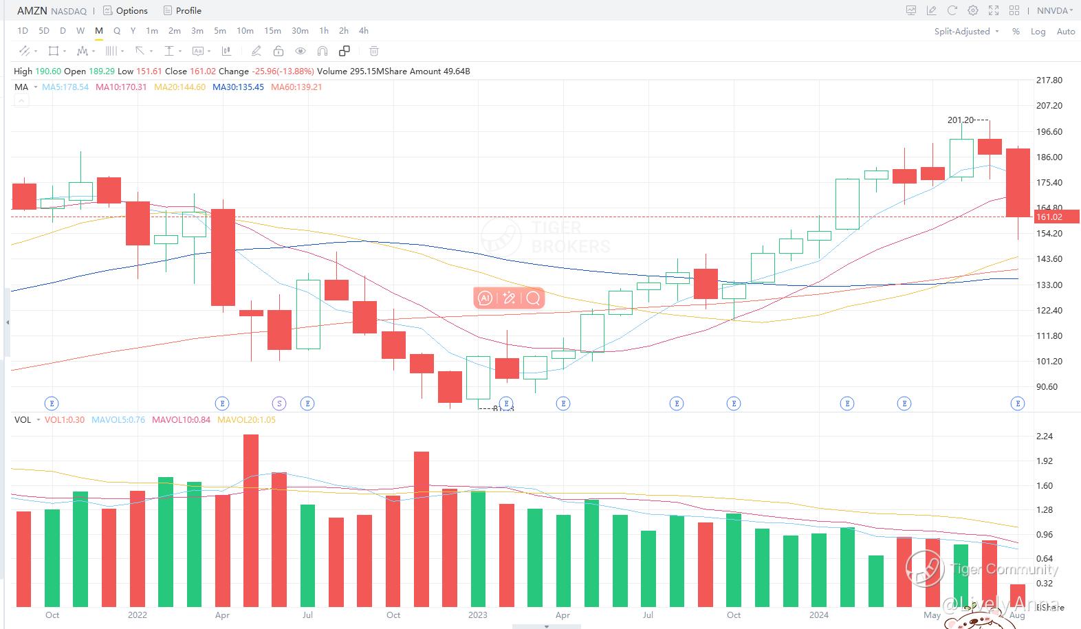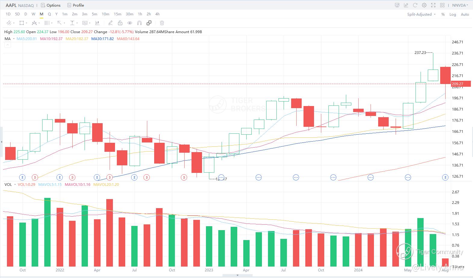 On Monday, August 5, the S&P 500 index fell by 3.3%, marking its largest single-day decline since September 2022. The Nasdaq 100 index dropped by 3%, resulting in a market value loss of $907 billion. Apple (AAPL) fell by 4.82%, experiencing its worst single-day performance since September 2022, closing at $209.27. Nvidia declined by 6.36%, Google A dropped by 4.45%, Tesla fell by 4.23%, Amazon decreased by 4.1%, Microsoft was down 3.27%, and Meta dropped 2.54%. Additionally, Eli Lilly fell by 3.63%, Berkshire Hathaway Class B shares declined by 3.42%, TSMC ADR dropped by 1.27%, while AMD increased by 1.75%.
