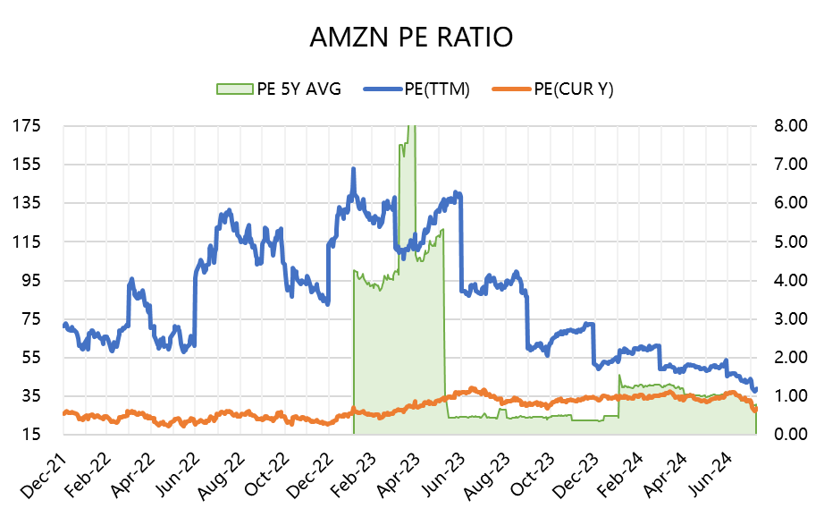 AMZN: PE (TTM) is 38.9x, and Forward PE projected at Consensus EPS in 2024 is 28.57x, or an implied 36% upside; and the PEG declines from 1.0x to 0.8x as growth rises.Amazon's profits are more volatile, and so the current deal also incorporates expectations of future growth declines.