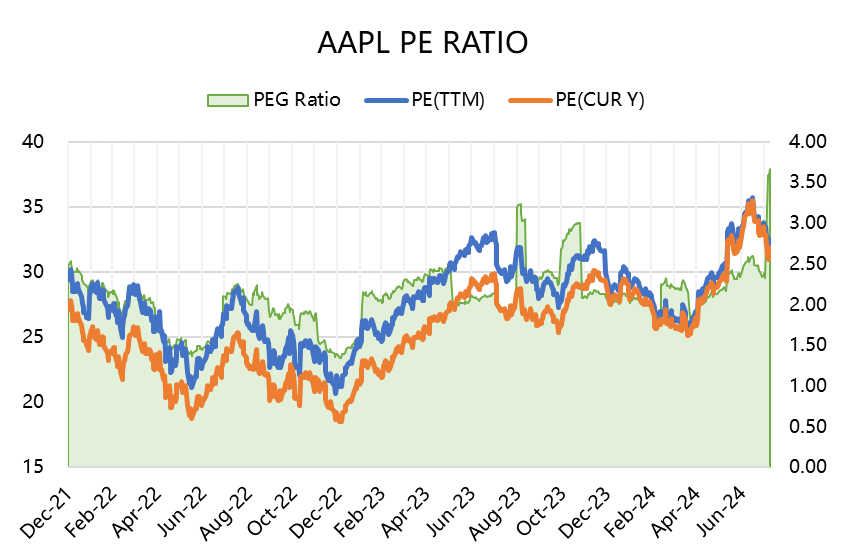 AAPL: PE(TTM) is 32.5x and Forward PE projected at Consensus EPS in 2024 is 31.8x, or an implied 2% upside; and the PEG jumped from 2.3x to 3.6x as the growth rate declined, not a good sign, but the current deal adds in the expectation of growth from the release of the new AI machine.