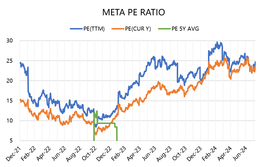 META: PE (TTM) is 24.7x, and Forward PE projected with Consensus EPS in 2024 is 23.7x, which is also an implied 4% increase; the growth rate is basically the same as the market's expectation, so the PEG stays around 1.1x. META's social media advertising business also performs strongly among its peers, and the market's relative recognition of its AI realizing ability is also relatively safe.META's social media advertising business is also strong among its peers, and the market has relatively recognized its AI cash flow ability, so its valuation remains in a stable range and is relatively safe.
