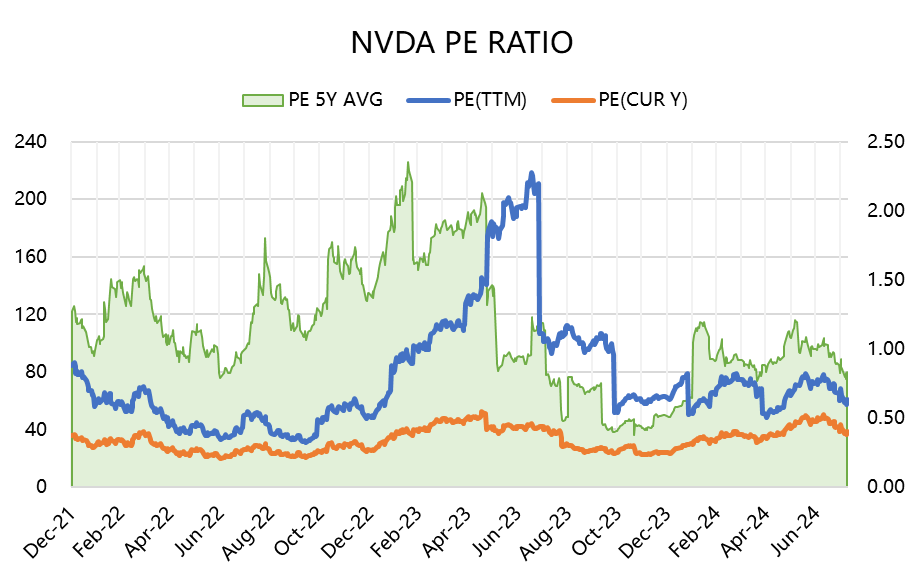 NVDA: PE (TTM) is 61.1 times, with Consensus EPS in 2024 to the projected Forward PE of 38.9 times, is also an implied 57% rise; the market ate more thoroughly on its growth, PEG from 1 times down to 0.8 times.NVDA after the end of the 2024 PE is actually not too high in big tech, while the 2025Expected growth rate, in fact, PE can also return to below 30 times, but now the market is also worried about AI growth prematurely into the inflection point, so that no matter whether PE multiples or PEG multiples, is a huge blow, will appear to be a higher valuation, so the pullback is also considered violent.