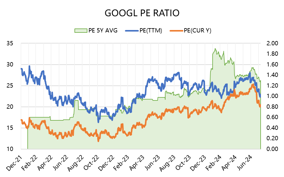 GOOGL: PE (TTM) is 22.9x, the lowest of all big techs, and Forward PE of 20.47x projected on Consensus EPS in 2024 is also implying a 12% gain; and PEG declines from 1.4x to 1.3x as growth rises.Google trades relatively cheaply, and implicitly, the market is concerned that search advertisingconcerns about possible market capture by AI.