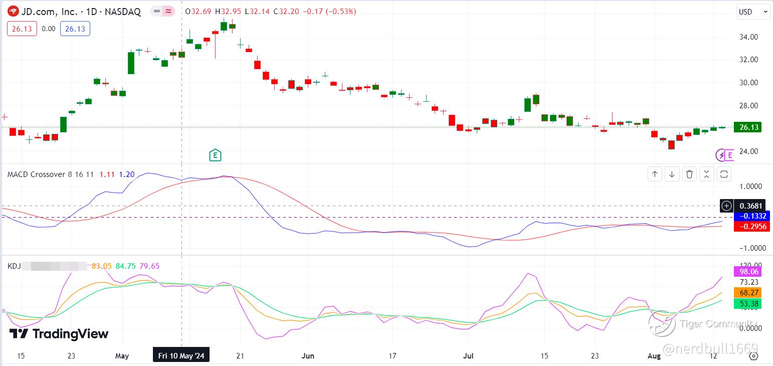 Looking at technical, JD is looking to form a potential upside from the MACD, and the KDJ is having a comfortable upward trend.