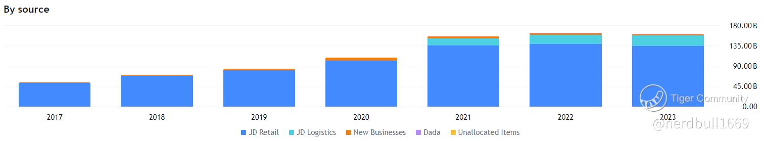 JD.com, Inc. revenue for the last year amounted to 152.77 B USD. The highest performing revenue source is JD Retail, in 2023 it was bringing 138.10 B USD. The greatest contribution to the revenue figure was made by China, in 2023 it brought JD.com, Inc. 153.09 B USD, and in 2022. 155.37 B USD.