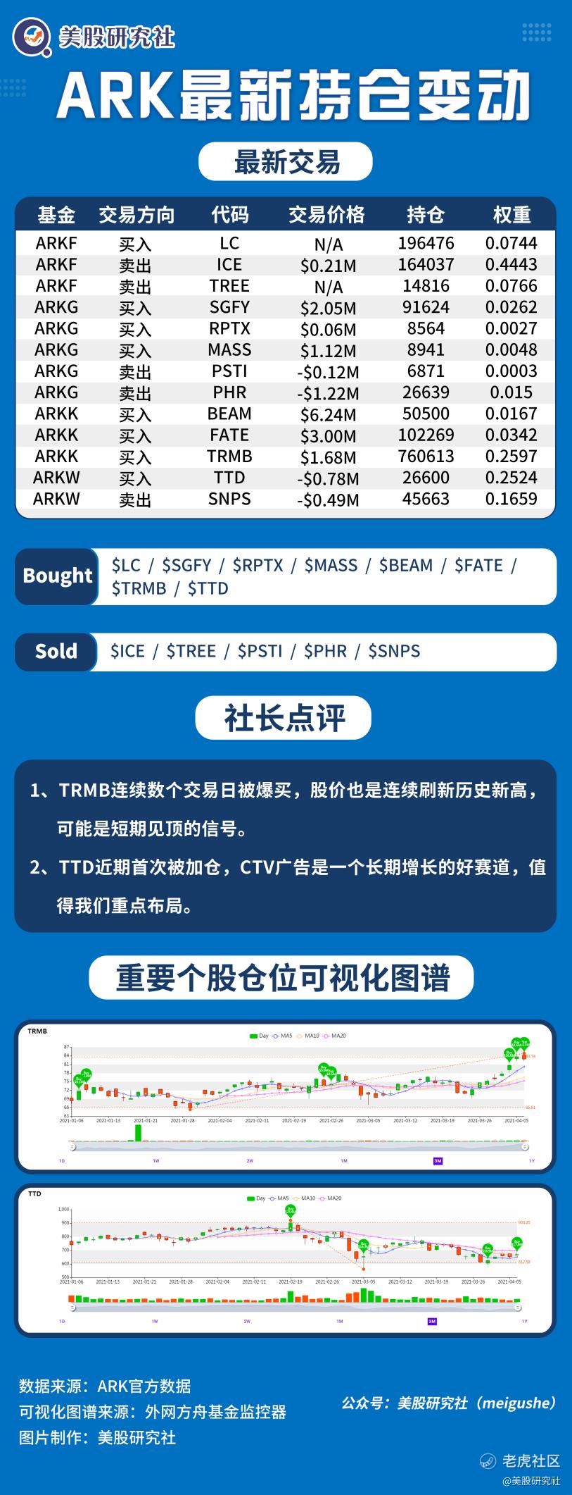 由於ARK基金管理的ETF的業績非常出色,ARK會公佈每日持倉動作。4月7日,美股研究社整理該基金持倉動作如下: