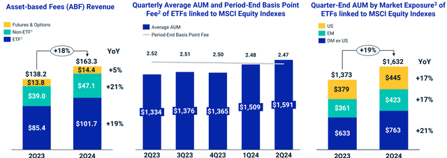 Asset-based fees grew 18% from the prior year, benefiting from an increase in AUM by 19% from the prior year, and in the quarter, MSCI saw $28 billion cash inflows into MSCI-linked equity ETFs and $21 billion in market appreciation in the second quarter.