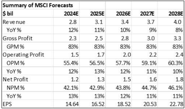 Summary of my 5-year financial forecasts for MSCI (Author generated)