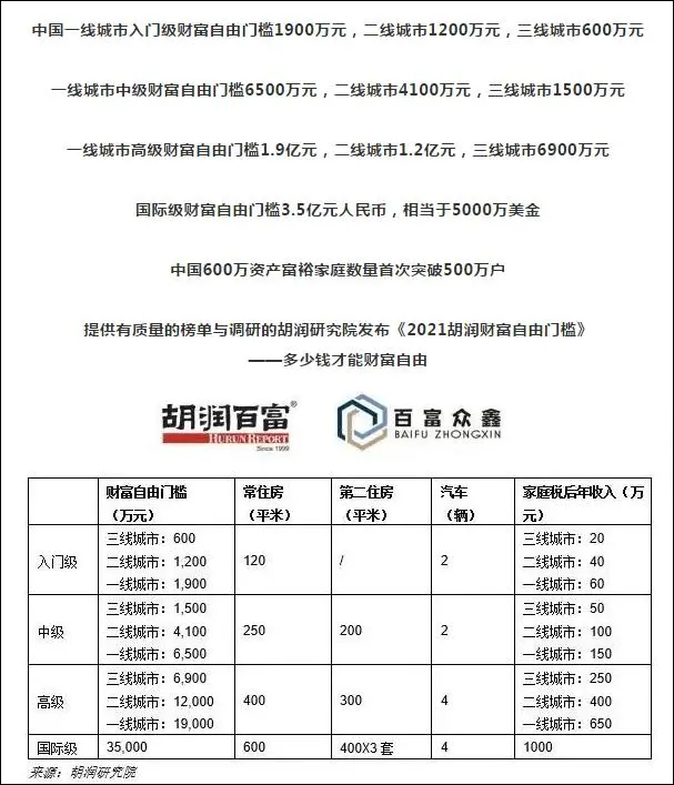 最近胡潤聯合百富衆鑫出了一個《2021胡潤財富自由門檻》,其中的財務自由標準分爲入門級、中級、高級和國際級四個階段,並細分到中國一二三線三類城市。具體的門檻在下表中列出:
