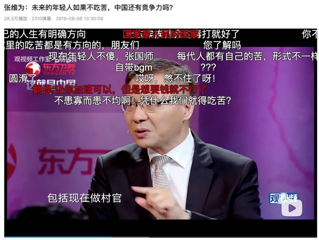 前不久B站上有段張維爲的視頻,內容是勸年輕人多吃苦,結果這位一向被粉紅青年們熱愛的張教授,評論區和視頻彈幕居然翻車了。這說明年輕人有自己的思想,一旦談到涉及自身利益的話題時,他們就會變得很敏感,並具有很強的獨立思考和邏輯思維能力。相比吃苦,他們大多數人顯然更追求財務自由。