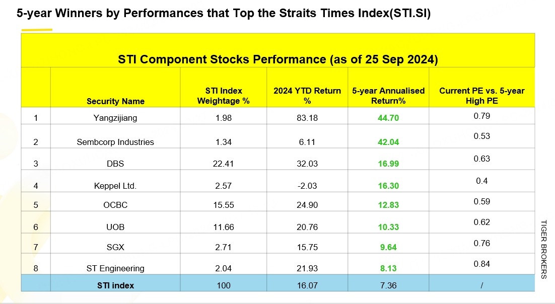 1. 5-year winners by performances that top the $Straits Times Index(STI.SI)$are : $YZJ Shipbldg SGD(BS6.SI)$, $SEMBCORP INDUSTRIES LTD(U96.SI)$ , $DBS Group Holdings(D05.SI)$ ,$Keppel(BN4.SI)$, $ocbc bank(O39.SI)$ , $UOB(U11.SI)$, $SGX(S68.SI)$, $ST Engineering(S63.SI)$.
