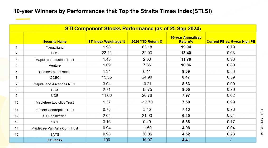 2.10-year winners by performances that top the $Straits Times Index(STI.SI)$are: $YZJ Shipbldg SGD(BS6.SI)$ , $DBS Group Holdings(D05.SI)$, $Mapletree Ind Tr(ME8U.SI)$ , $Venture(V03.SI)$ , $SembCorp Industries Ltd.(SCRPY)$ , $ocbc bank(O39.SI)$ , $CapLand Ascendas REIT(A17U.SI)$ , $SGX(S68.SI)$ , $UOB(U11.SI)$ , $Mapletree Log Tr(M44U.SI)$ , $Frasers Cpt Tr(J69U.SI)$ , $ST Engineering(S63.SI)$ , $CapLand IntCom T(C38U.SI)$ , $Mapletree PanAsia Com Tr(N2IU.SI)$, $SATS LTD.(S58.SI)$