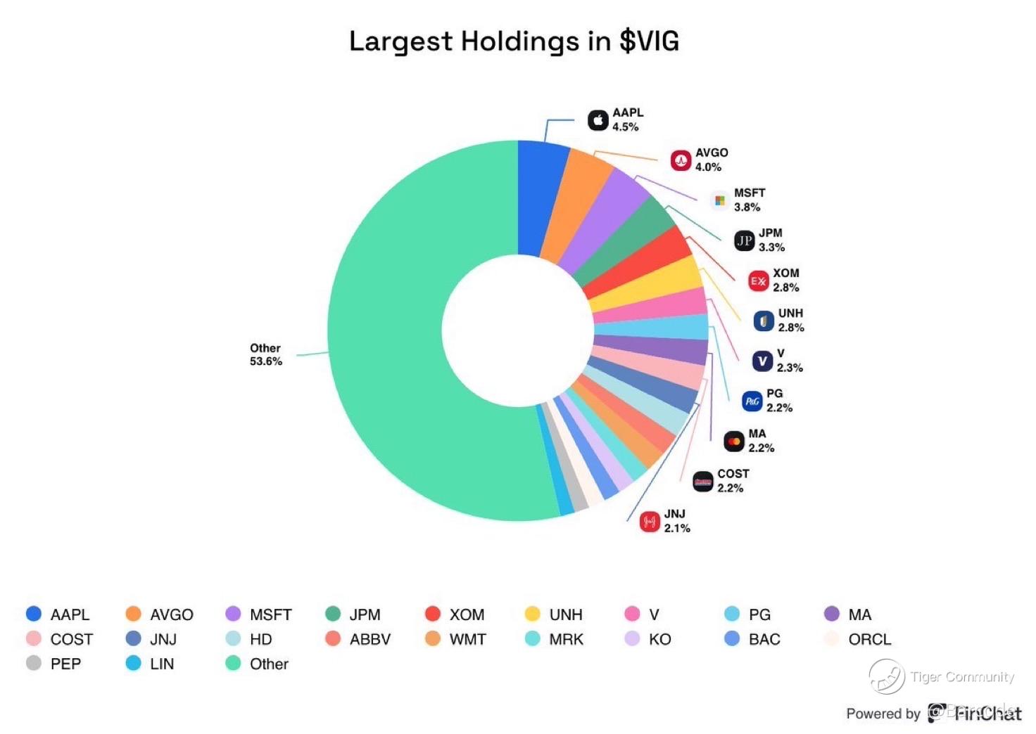 • VIG includes blue-chip stocks like Apple (AAPL), Microsoft (MSFT), Costco (COST), JPMorgan (JPM), and Procter & Gamble (PG),making it tech-heavy and growth-focused. These companies provide a balance of long-term stability and growth potential. 🍏💻🏬🤖🚀
