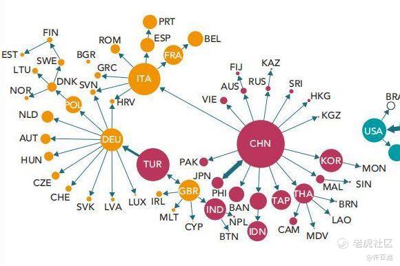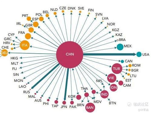 我們來看下兩張圖,第一張圖是2017年世界棉紡業的貿易圖,我們會發現整個全球的棉紡織業中國就像一座特大城市穩居在中央,而其他國家就像衛星城一樣圍繞着我們。