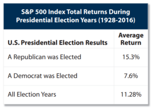 What we know is that the markets strongly favour a Republican president: in all election years between 1928 and 2016 when a Republican was elected, the average annual $.SPX(.SPX)$ return was 15.3%.