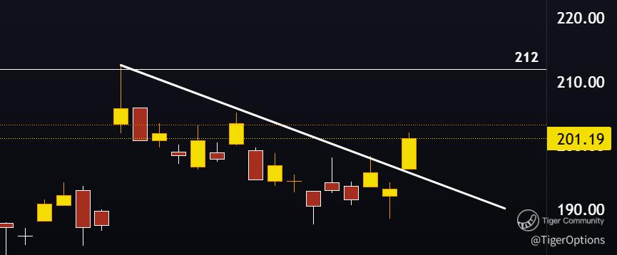 Looking at the chart, the price breakouts from a downtrend line and definitely has the potential to retest the ATH at around 212.