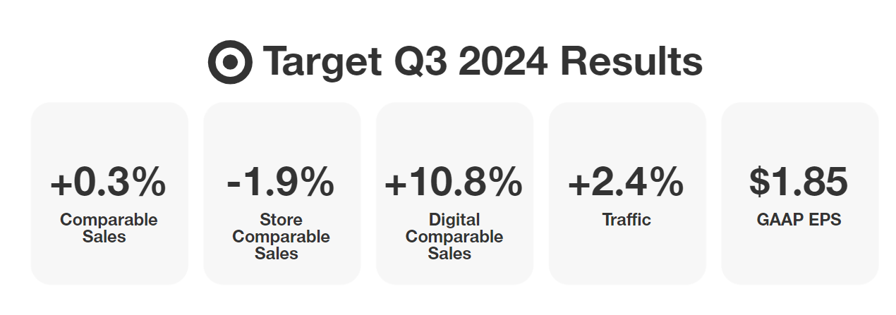 $Target(TGT)$ plunged 21% after its Q3 earnings report, seemingly encountering yet another major challenge since the inflation crisis, with its weaker-than-expected performance, as reflected in its financials, the performance of its various business segments, and its outlook, similarly falling short of the company's own guidance from last quarter.